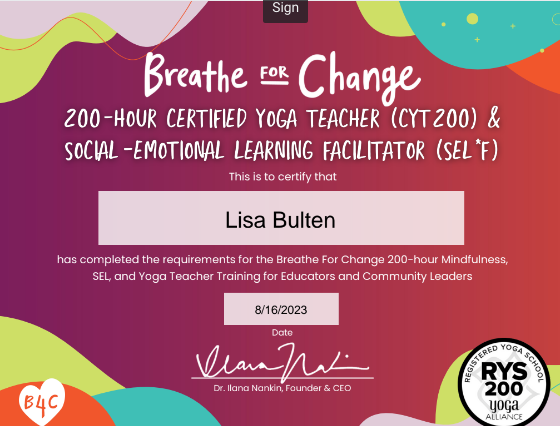 I am currently taking the additional 300 level class which will grow my capacity both in Breathe for Change's model for Yoga and Social Emotional Learning instruction.